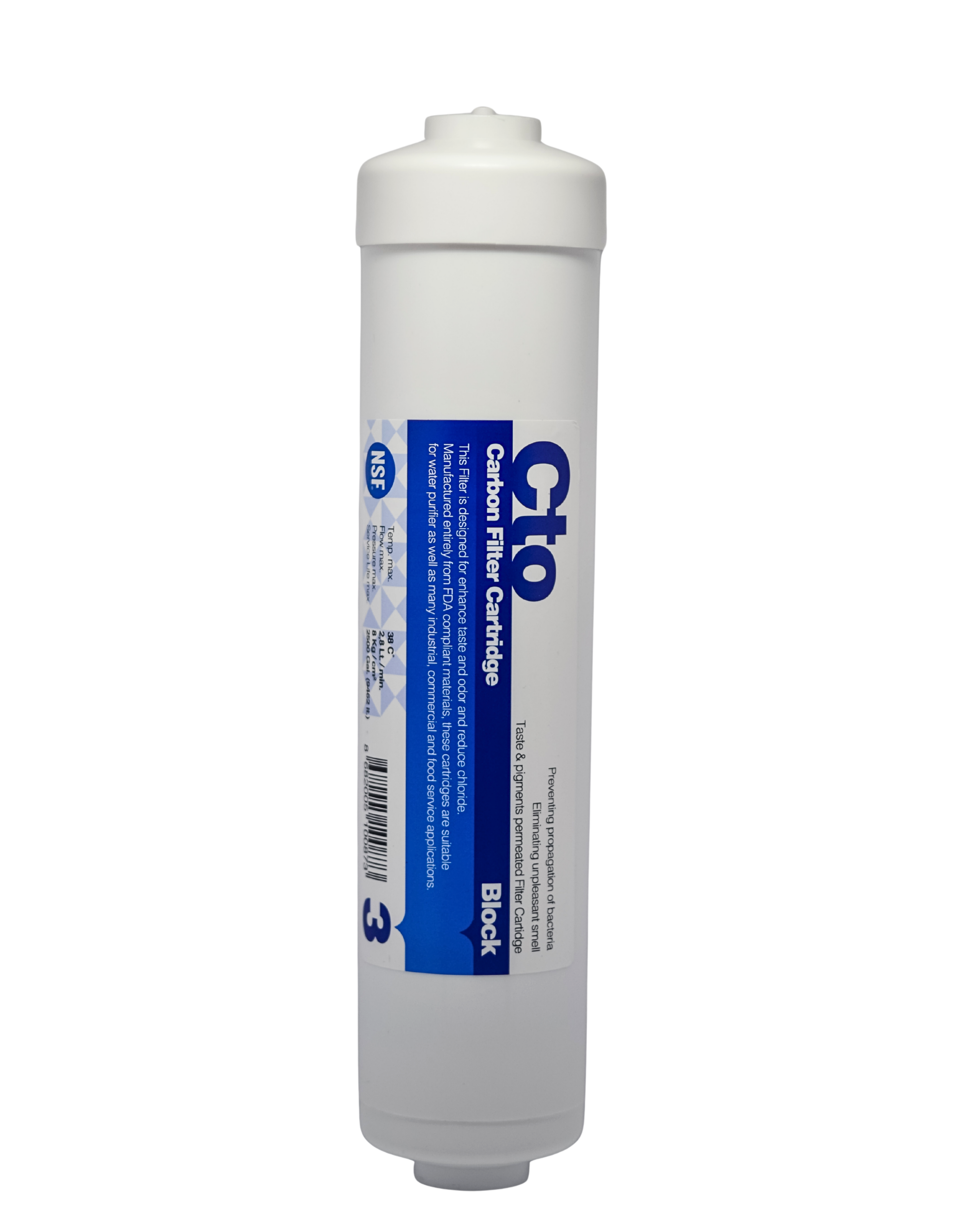CTO Inline Carbon Block 2,5" (etapa 3) 💧 🧱 Cartuș liniar de carbon tip CTO (Carbon Block), destinat filtrării sorbtive profunde a apei în sistemele de osmoză inversă și filtrele de apă potabilă. 🥥 Conține carbon act...